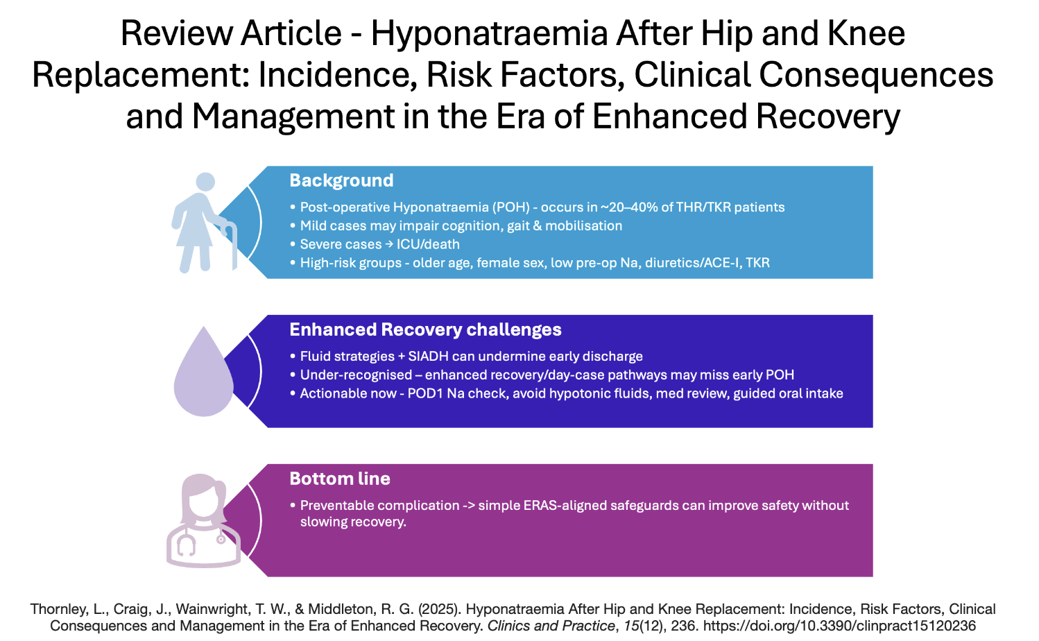 The narrative review examines the incidence, risk factors, and clinical implications of postoperative hyponatraemia following total hip and knee replacement. The findings highlight that hyponatraemia occurs in approximately 20–40% of patients undergoing these procedures and may negatively affect cognitive function, gait, rehabilitation participation, and length of hospital stay. The paper also emphasises the need for improved risk stratification, monitoring, and pathway integration within enhanced recovery programmes to reduce preventable complications.