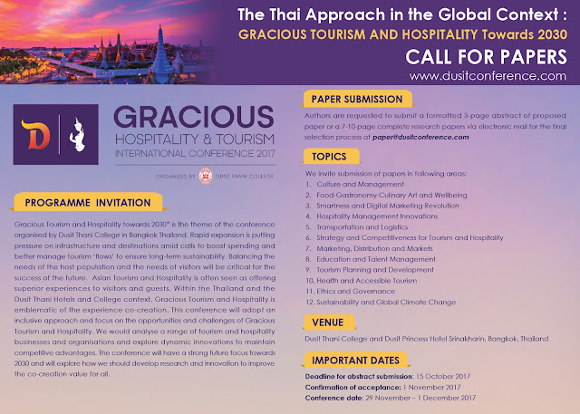 Gracious Tourism and Hospitality towards 2030 is the theme of the conference organised by Dusit Thani College in Bangkok Thailand. November 29 to December 1, 2017 dusitconference.com
