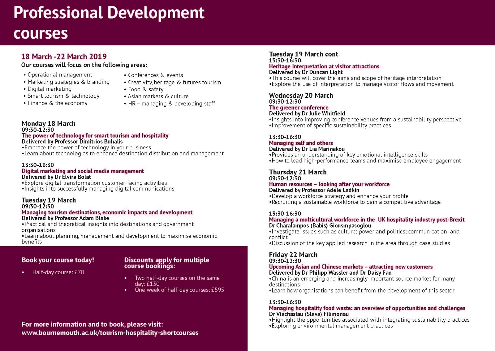 Bournemouth University Department of Tourism and Hospitality Top 10 in the world in the QS World University Rankings by Subject 2019: Hospitality & Leisure Management.