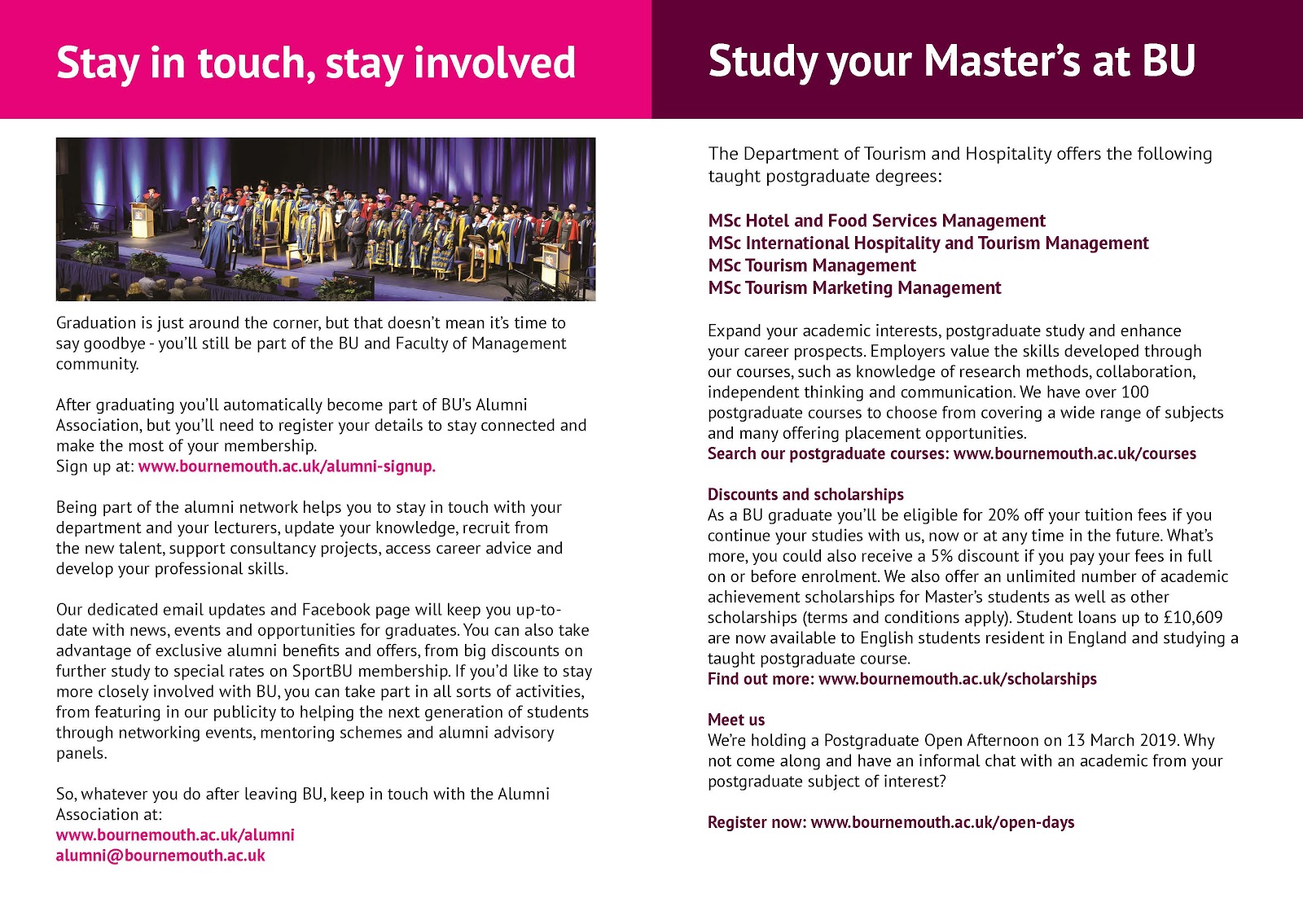 Bournemouth University Department of Tourism and Hospitality Top 10 in the world in the QS World University Rankings by Subject 2019: Hospitality & Leisure Management.